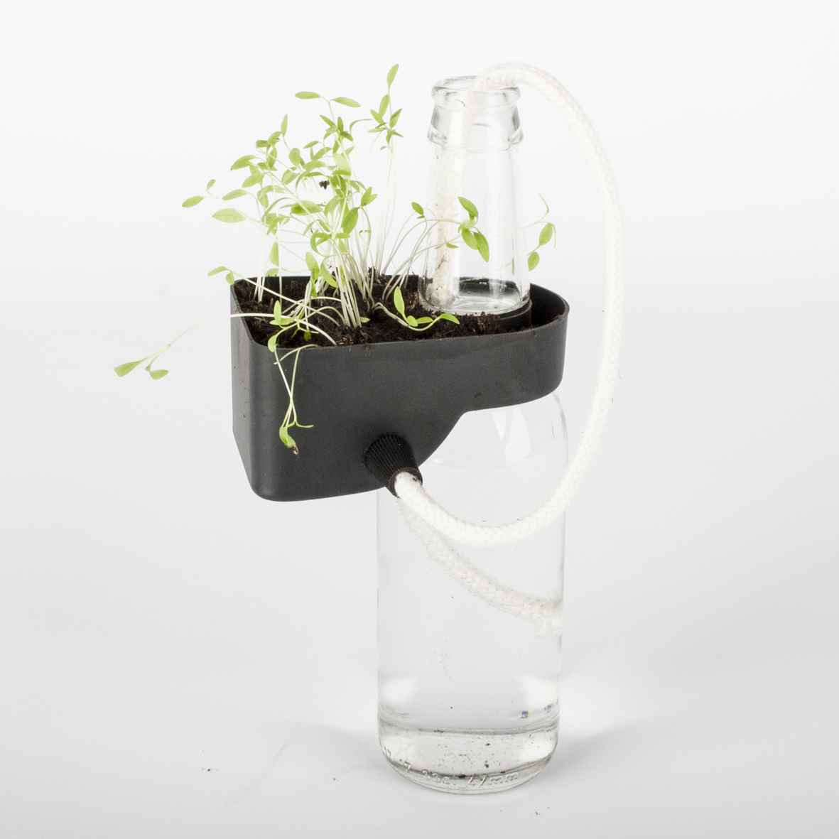The pack consists a tray that you can easily hang over the included bottle and the cotton cord will transport the water from the bottle up to the tray, where your herbs will grow!