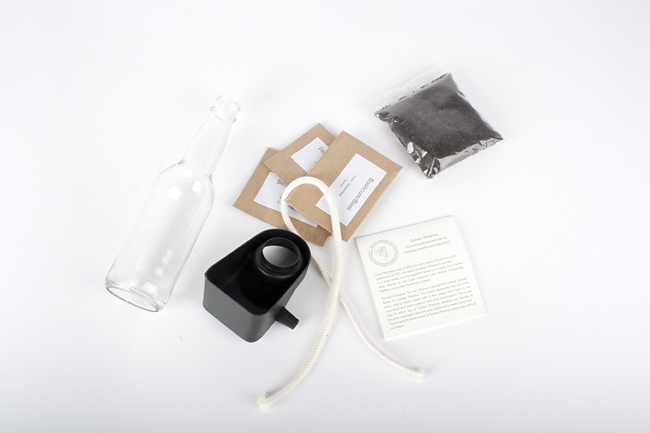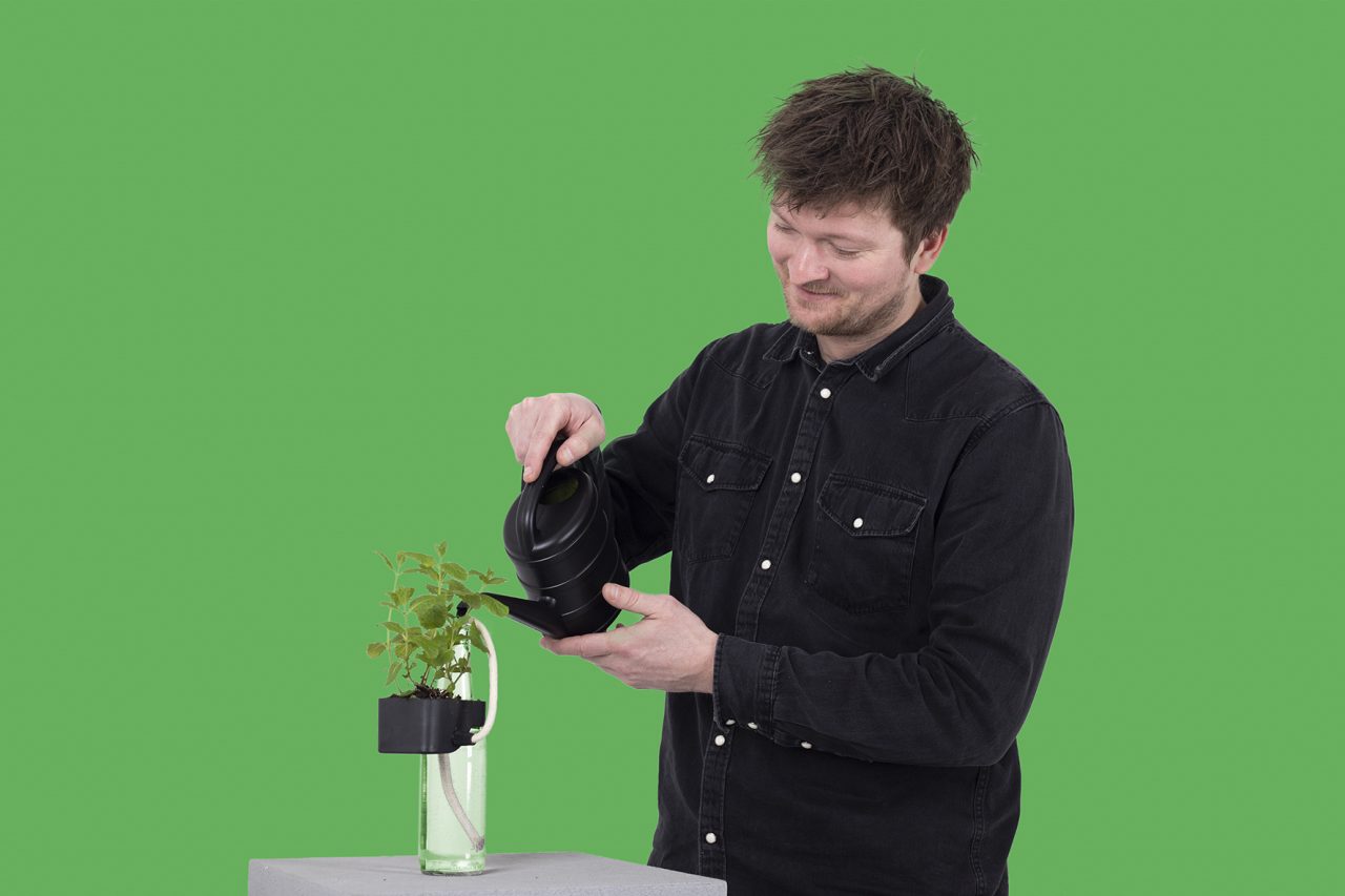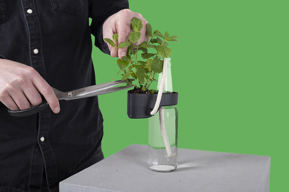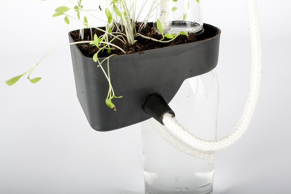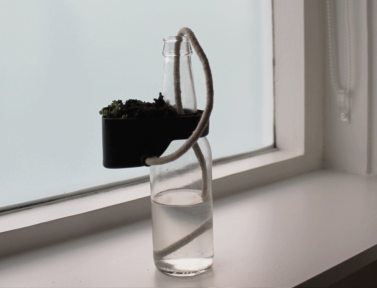 After we found out that we could transmit water by using cotton thread and bottles can be used as reservoir, we decided to melt these objects function and shape together to create the ideal environment for growing your own herbs. Now you can, for example, grow your herbs on the windowsill that is self-sufficient and insightful.