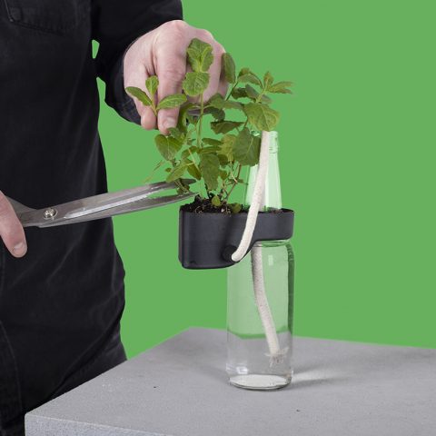 After we found out that we could transmit water by using cotton thread and bottles can be used as reservoir, we decided to melt these objects function and shape together to create the ideal environment for growing your own herbs. Now you can, for example, grow your herbs on the windowsill that is self-sufficient and insightful.